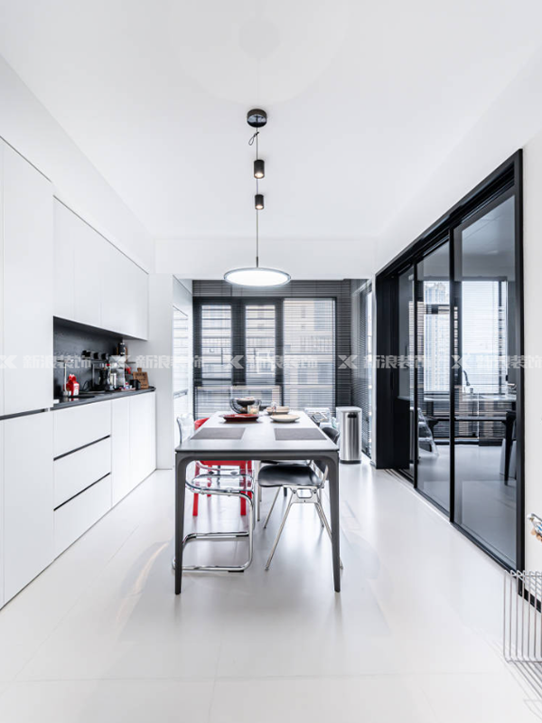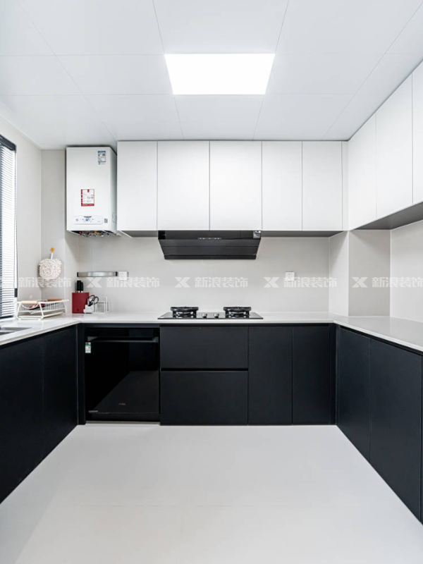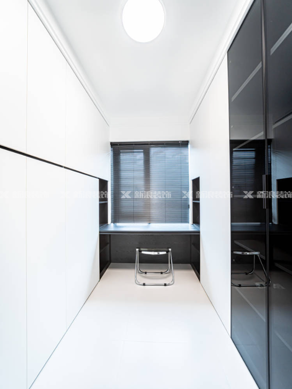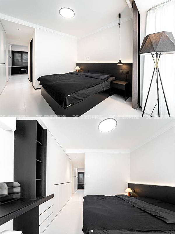 以簡約、線條明晰的黑白兩色為主色調,全房同色瓷磚通鋪。