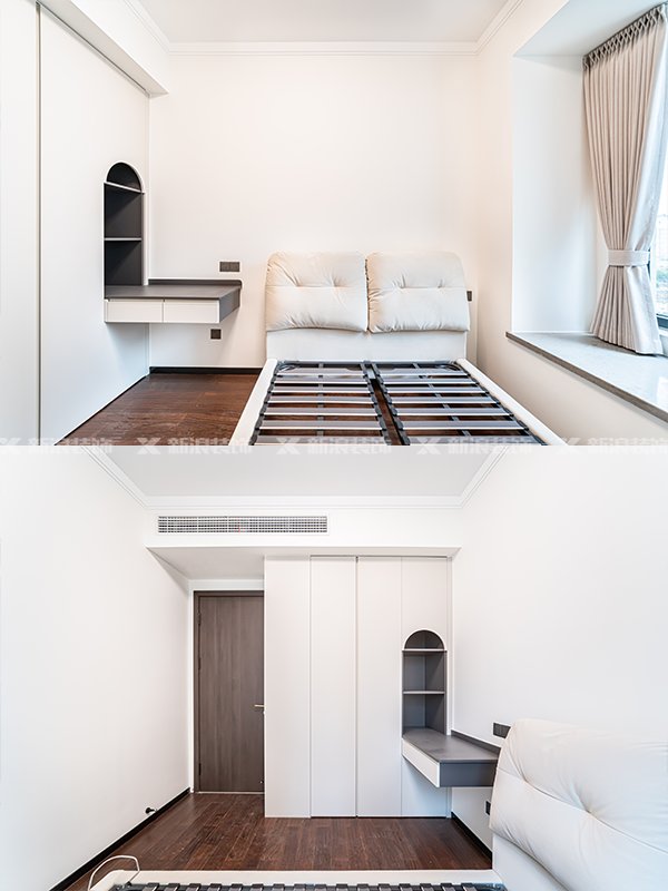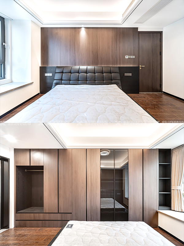 主臥擯棄轉交衣帽間,采取床尾柜更加大氣,背景墻也有增加氛圍感、整體感的作用。衣帽間的鍍膜玻璃,也可以讓我們避免鏡子小的尷尬處境!
